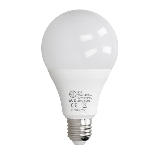 Teknisk information: Fabrikat / Model: E27 LED pære Energiklasse: A + Lysstyrke: 1400 lumen Forbrug i watt: 18 Watt Vinkel: 270 ° Livet i timer: 50.000 t .Farve: Varm hvid Driftstemperatur: -20 til 50 ° C Farve temperatur i Kelvin: 3000K - varm hvid Start tid: 1 sekunder Kan lysdæmpes: Nej Dimensioner: 140 mm x 80 mm Hydragyrum: 0 g Hg / kviksølv Strømforbrug: 18 kWh / 1000H Base: E27 Spænding: AC 220-240 Volt