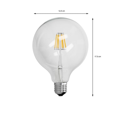 Teknisk information: Fabrikat / Model: E27 6W LED Fatning: E27 LED type: LED glødetråd Vinkel 120 ° Strømforbrug: omkring 6 kWh / 1000H Energiklasse: A + Drift spænding: AC 220-240V / 50-60Hz Farve temperatur: 2800K Strømforbrug 6 watt Sammenligningsværdi: 6W svarer til ca. 40W (pære) Drift: -20 ° C - + 40 ° C Lysstyrke: 624 lumen Lysfarve: varm hvid Diameter: nogle 125 kilometer mm . Længde herunder basen: ca.175 mm Livet i timer: 50.000 t .Skifte cyklusser: 20.000 Strøm: 240mA Leveringstid: <0,5 s = 100% Ingen forsinkelse - Instant 100% lysstyrke Farvegengivelse: Ra 80 Hydragyrum: 0 g Hg / kviksølv Kan lysdæmpes: Nej Materiale: Krop: glas, bund: metal