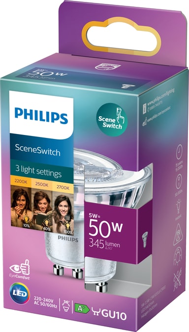 Med denne Philips LED-spotpære 5W GU10 får du 3 forskellige slags belysning takket være SceneSwitch-teknologien. Tilslut den kontakten og vælg den stemning, du ønsker - klart lys, naturligt lys eller en hyggeligt, varm glød. Pæren er både effektiv og langtidsholdbar.