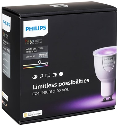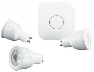 Philips White and color ambiance startsæt giver dig alt du har brug for, for at komme i gang med trådløs kontrol af din belysning via din smartphone. Pakken indeholder 3 Hue el-pærer, 1 bridge, 1 Ethernet netværkskabel og en strømadapter.