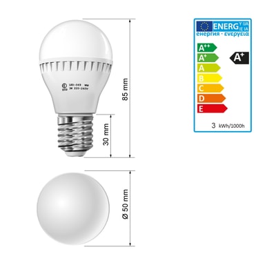 Teknisk information: Mærke / Model: E27 LED pære type 2 Energiklasse: A + Lysstyrke: 200 lumen Forbrug i watt: 3 watt Vinkel: 270 ° Livet i timer: 50.000 t .Farve: advare hvid Driftstemperatur: -20 til 50 ° C Farve temperatur i Kelvin: varm hvid 2800K Start tid: 1 sekunder Kan lysdæmpes: Nej Dimensioner: 85 mm x 50 mm Hydragyrum: 0 g Hg / kviksølv Strømforbrug: 3kw / 1000H Base: E27 Spænding: AC 220-240 Volt