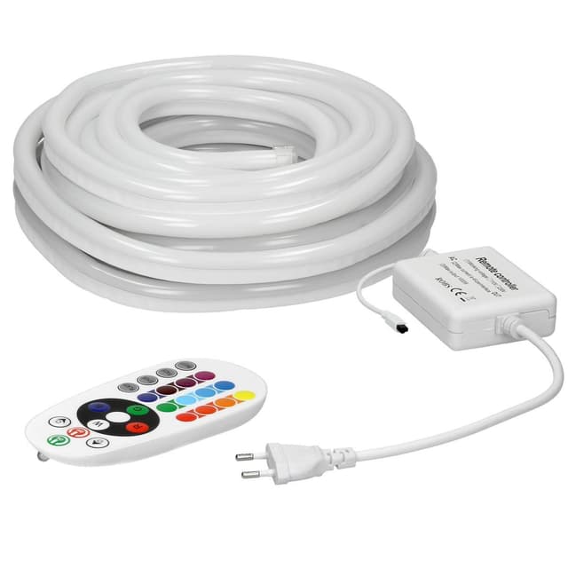 Leveringsomfang: 1 x LED Neon bar 9m RGB 1 x LED controller 1 x Fjernbetjening 24 taster Tekniske specifikationer: Model RGB LED Neon Størrelse: 12 x 20 mm Driftsspænding: 230V LED type: SMD LED-chip: 5050 Antal lysdioder: / m 60 lLæs mere om produktet