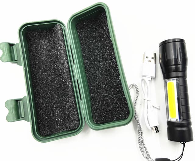 Denne genopladelige USB-lommelygte er bygget med COB-sidelys, som kan give lys sidebelysning, bredere rækkevidde. IPX4 vandtæt og kompakt størrelse, ideel til hjemmeliv, udendørs camping, nødbrug.