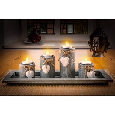 - Sæt med 4 hvide LED-lys (3,8 x 3,7cm hver) - Unik flammeeffekt og ægte voksbelægning - kan knapt skelnes fra rigtige lys - Med timerfunktion - 6 timer on / 18 timer off - Kan anvendes overalt hvor rigtige lys er for farlige eller ikke tilladte - Batteridrevne - 1 x 3 V CR2032 lithiumknapcelle hver (4 stk indgår i leverancen) - Obs: Beskyt mod ekstrem varme og stærkt sollys, ellers smelter lysene