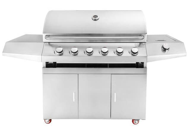 Fritstående gasgrill med 6 blus og sidebrænderModerne og fritstående gasgrill med låg af rustfrit stål. Stor grill med 6 kraftige blus og en sidebrænder, som giver dig mulighed for alsidig udendørs madlavning. Grillen har en stor grillflade på 97 x 50 cm og en stilren finish af rustfrit stål- 430SS. Porcelænsemaljerede greb, flammeskjold, grillrist, varmholdningsrist og et integreret termometer i låget. Du får en robust og prisgunstig grill til alle situationer udendørs!