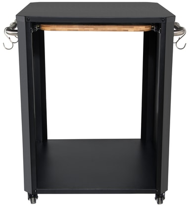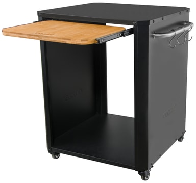 Cozze udebord til pizzaovn 90348/90350. Materiale: zinkbelagt og pulverlakeret matsort. Overtrækket er UV-bestandigt og tåler regn og sollys Farve: sort Mål: 60x60x80,5 cm. Monteret med 2 stk. rustfri gourmetstænger med tilhørende 6 stk. rustfri S-kroge. Inkl. 4 stk. letløbende, drejelige gummihjul m. bremse. Monteret med FSC®-certificeret udtræksbord/skærebræt 43x35 cm. på udtræksskinner.