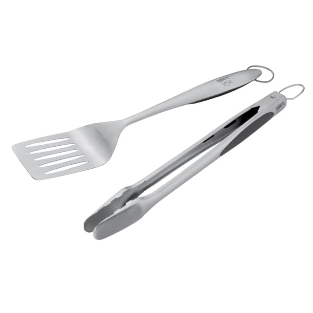 At vende kød, grøntsager, ost eller fisk bliver en leg med dette uundværlige Weber redskabssæt til grill 6707. Sættet inkluderer paletkniv og tang, som begge kommer i kvalitets rustfrit stål.