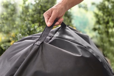 Takket være den praktiske strop til fastgøring er coveret let at montere og holdes på plads - selv i stærk vind.