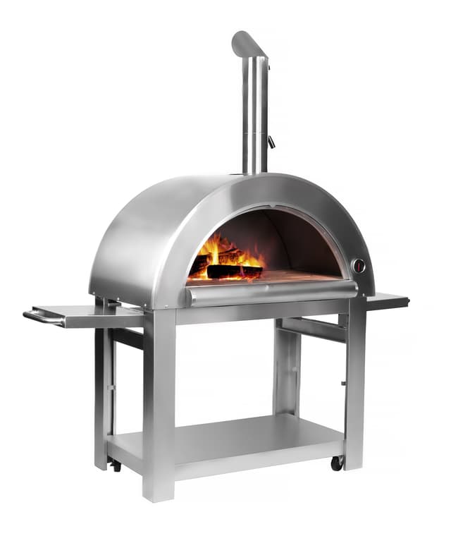 Moderne og fritstående træfyret pizzaovn i 100% rustfrit stål 304. Denver kan gå op til 350°c på 10 minutter, og efter blot 30 minutter kan temperaturen nå hele 500°c. Når varmen er nået, hjælper konstruktionen med yderskallen til at holde varmen, indtil alle middagsgæsterne er ankommet. Inde i pizzaovnen er der et tykt lag ildfast tegl, hvor du tilbereder maden. Nederst finder du et rustfrit stativ, som er fremragende til opbevaring af træ. Denver står på fire hjul, hvilket gør den utroligt smidig og let at håndtere. En robust ovn, som garanteret laver de bedste pizzaer! Selvfølgelig kan du også lave andet mad og bagværk i den. En pizzaovn, som vil få middagsgæsterne til at måbe!