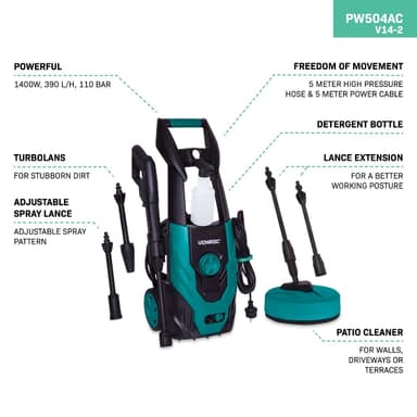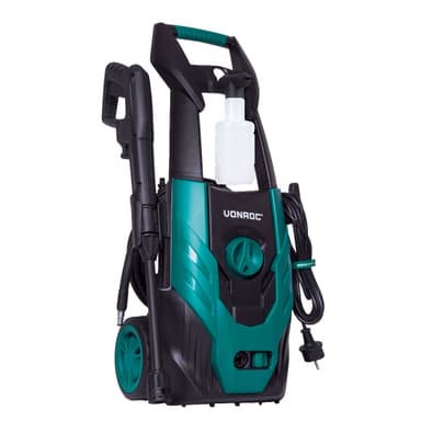 Denne 1400W højtryksrenser fra VONROC leverer op til 390 liter vand i timen ved et tryk på op til 110 bar. Den leveres komplet med sprøjtepistol, justerbar og turbo-dyse, terrassevasker, sæbeflaske og mere – så du kan komme i gang med det samme!