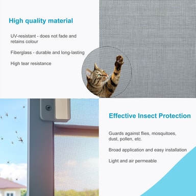 Vores flammehæmmende fluenet i glasfiber af høj kvalitet giver dig - sammenlignet med andre materialer - lang levetid på dine døre og vinduer. Takket være den UV-bestandige glasfiber falmer nettet ikke og bevarer sin rivestyrke. Den høje rivestyrke forhindrer også, at enderne af nettet flosser. Den beskyttende skærm holder insekter og andre miljøpåvirkninger som pollen og støv ude. Afhængigt af omstændighederne kan den fastgøres med klemmer, velcro, klæbestrimler eller dobbeltklæbende tape. Dette produkt sælges i metermål, dvs. 1 ordre = 1 meter. Dimensioner: Bredde: 100 cm. Maskebredde 1,2 mm.