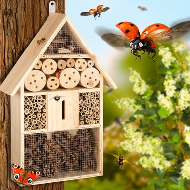 Dette fine insekthotel er det ideelle ly til redebygning og hjælp til overvintring for små nyttige insekter i haven. Udover at kunne bruges af insekterne året rundt, så fungerer det klassiske insekthotel også som et fint blikfang i haven.
