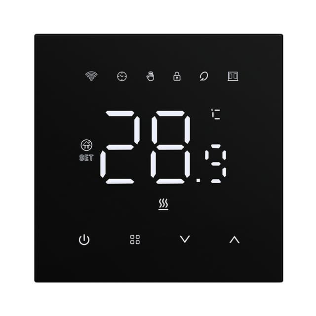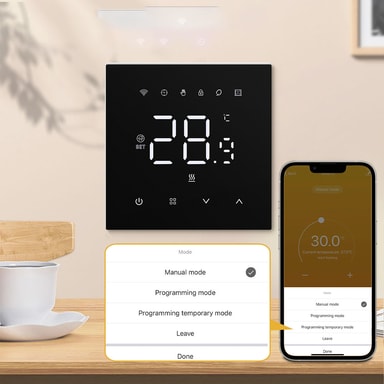 Flere Tilstande: Denne termostat tilbyder alsidig drift med fire forskellige tilstande: APP stemmestyring/manuel tilstand, programmeringstilstand, midlertidig programmeringstilstand og væk-tilstand. Tilpas din varmetidsplan, så den passer til din daglige rutine, eller skift til manuel tilstand for øjeblikkelige justeringer. Væk-tilstanden hjælper med at spare energi, mens du er ude, og den midlertidige programmeringstilstand giver mulighed for hurtige tilsidesættelser uden at forstyrre din almindelige tidsplan. Denne fleksibilitet sikrer effektiv og personlig varmestyring.