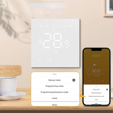 Flere Tilstande: Denne termostat tilbyder en række tilstande, der passer til din livsstil. Vælg mellem manuel tilstand til direkte temperaturjusteringer, programmeringstilstand til opsætning af ugentlige varmeplaner, midlertidig programmeringstilstand til tilsidesættelse af planen, når det er nødvendigt, og fraværsfunktion til energibesparelse, mens du er ude. Fleksibiliteten i disse tilstande sikrer, at dit varmesystem altid er optimeret til din komfort og energieffektivitet. Skift nemt mellem tilstande via appen eller termostatens intuitive grænseflade.