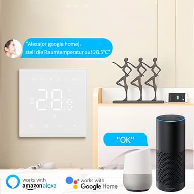 Smart Kontrol: Styr nemt dit hjems elektriske gulvvarme med vores WiFi-aktiverede smarte termostat. Kontroller temperaturen hvor som helst ved hjælp af Tuya-appen på din smartphone eller tablet. Nyd bekvemmeligheden ved at justere din varmeplan, mens du er på arbejde, på ferie eller bare slapper af i sofaen. Den intuitive app-grænseflade giver mulighed for nem programmering og overvågning af dit varmesystem, hvilket sikrer optimal komfort og energibesparelser. Kompatibel med stemmestyringssystemer til håndfri betjening.