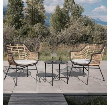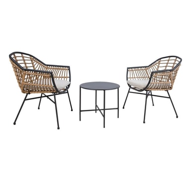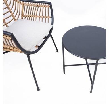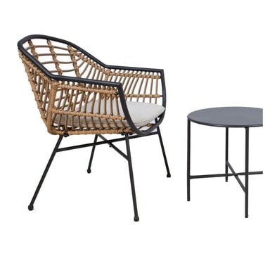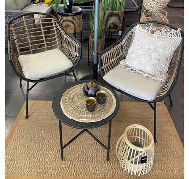 Altansæt LUNDE bord og 2 stole. Det komfortabelt formede stolestel er lavet af stål og afsluttet med en sort pulverlakering. Stolens sæde er beklædt med en luftig plastfletning, der ligner naturlig rattan. Sædehynder medfølger. Pudebetrækket er lavet af beige polyesterstof. Bordpladen og bundrammen er lavet af stål og afsluttet med en sort pulverlakering. Målene på stolen er 64x64xH85cm, og bordets mål er D50xH45cm. Produktet er holdbart i skiftende vejrforhold og meget nemt at vedligeholde, kun puder behøver beskyttelse mod vejret. For at forlænge levetiden på udendørsmøbler anbefaler vi brugen af udendørsmøbelbetræk. OPBEVARING: i slutningen af sommersæsonen anbefaler vi at opbevare havemøblerne indendørs. Rengør og tør møblet inden opbevaring. Brug et tørt, godt ventileret rum til opbevaring.