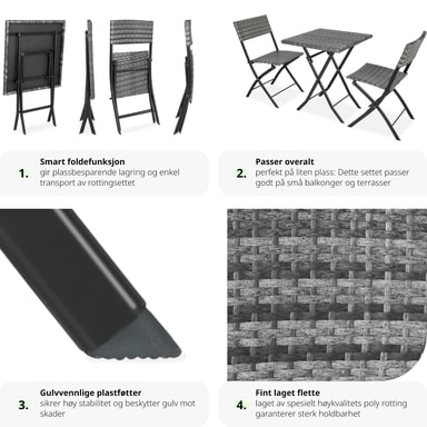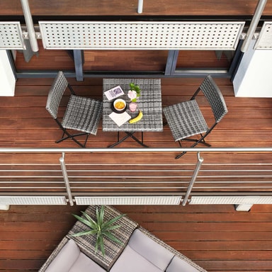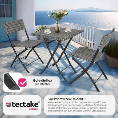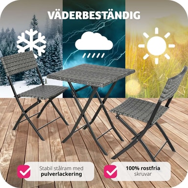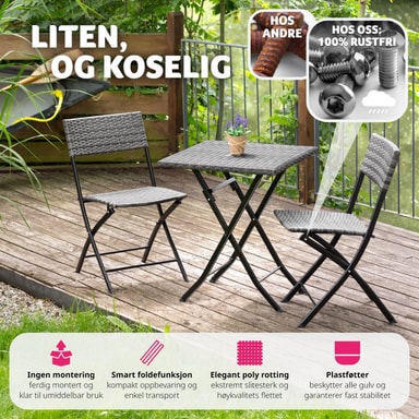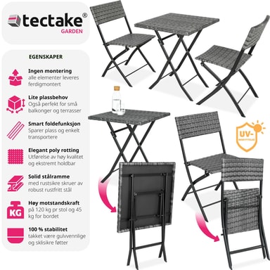 Dette tredelte cafésæt fra tectake overbeviser med sit smarte look og høje fleksibilitet. De kompakte havemøbler er ideelle til små balkoner, terrasser eller på altanen. Når de ikke er i brug, kan de enkelte elementer klappes sammen.Læs mere om produktet