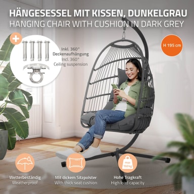 Uanset om det er på terrassen, i haven eller indendørs, giver hængestolen dig den højeste komfort og ren afslapning. Og det bedste: Du får de matchende sædehynder direkte med i købet! De har en lynlås på bagsiden, så du nemt kan tage betrækket af. Det solide stel er stabilt og særdeles robust, og sammen med hynden giver det en behagelig og bekvem siddeoplevelse.