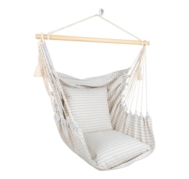 Gyngestol ANGEL beige. Gyngestolen er håndlavet af El Salvador-håndværkere, der respekterer den gamle kultur og traditionelle teknikker. Bomuldsstoffet er håndvævet. Farveskemaet er inspireret af den lokale natur. Polyestersnore sikrer bedre holdbarhed og styrke af gyngestolen. To bløde puder medfølger. Gyngen kan hænges på en kraftig gren eller bjælke. Det er også muligt at bruge et specielt hængekøjestativ til at hænge gyngen op. Hængestolens mål er 130x127cm og den samlede længde er 137cm. Længden på hængestangen i træ er 112 cm. Den maksimale bæreevne er 140 kg. VEDLIGEHOLDELSE: For at forlænge produktets levetid er det vigtigt at beskytte det mod vejret. Holdbarheden af stoffet og ledningerne falder på grund af UV-stråling og overdreven fugt, og farverne falmer. Vi anbefaler altid at opbevare gyngen i et tørt og godt ventileret rum efter brug. Lad gyngen tørre helt, inden den opbevares. Håndvask ved 40 grader er tilladt. Brug milde rengøringsmidler.