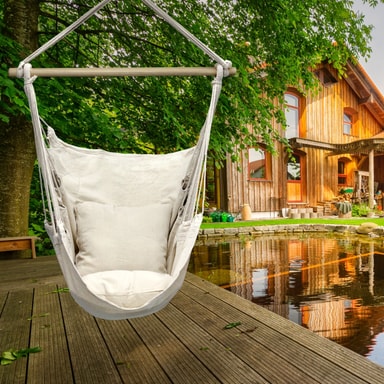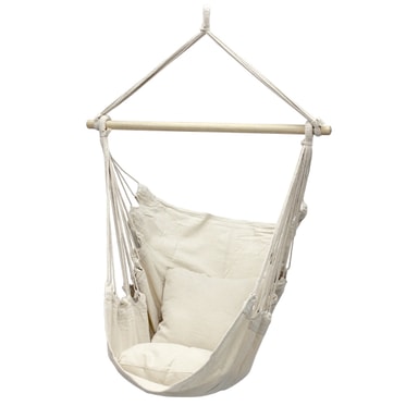 Leveringsomfang: 1x hængende stol med træpæl 2x pude 40 x 35 cm Tekniske specifikationer: Materiale: Bomuld / hårdttræ (B): 90 x 120 x 60 cm Stof Størrelse: 120 x 90 cm Personale: hårdttræ Farve beige Incl 2 puder:.Læs mere om produktet