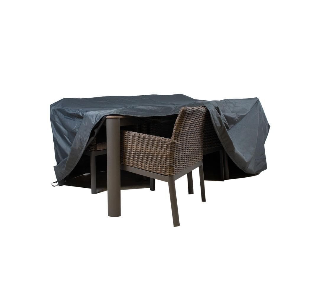 Møbelbetræk 170x170x90cm, vejrbestandigt. Møbelovertrækket holder havemøblerne rene og tørre og altid klar til brug. Møbelovertrækket er lavet af vandafvisende lamineret polyesterstof. Tapede sømme holder vand ude, og luftåbninger reducerer dampkondensering under betrækket. Den nederste kant af betrækket har en spændesnor, der gør, at betrækket kan fastgøres sikkert, og det bliver siddende selv ved hård vind. Materialets tekniske data: vægt 155±8 g/m², tykkelse >0,20 mm, vandtæthed ? 6000 mm, vandafvisende 4, farveægthed 6, UV-beskyttelse 600 ± 5 timer, åndbarhed 150-200 g/m²/24 timer, temperaturtolerance -30 til +80°C. OPMÆRKSOMHED! Havemøbelovertrækket giver beskyttelse til dine møbler og er med til at forlænge deres levetid, men garanterer ikke de samme forhold som indendørs opbevaring. I kraftig regn kan der samle sig vandpytter på overdækkede møbler. Fjern ophobet vand så hurtigt som muligt. Vask betrækket i henhold til plejevejledningen, der er vedlagt produktet. Brug af et møbelbetræk er ikke en passende løsning til opbevaring af havemøbler udendørs hen over vinteren.