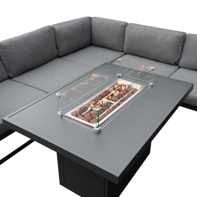 Centralt i dette enestående sæt er det genialt designede bålbord, der tilføjer et fængslende element til din udendørsoplevelse. Indlejret sømløst ind i bordets overflade og fyldt med naturlige vulkanske klipper, bliver ildstedet omdrejningspunktet og kaster en varm og indbydende glød, der forvandler dit udendørsområde til et hyggeligt tilflugtssted.