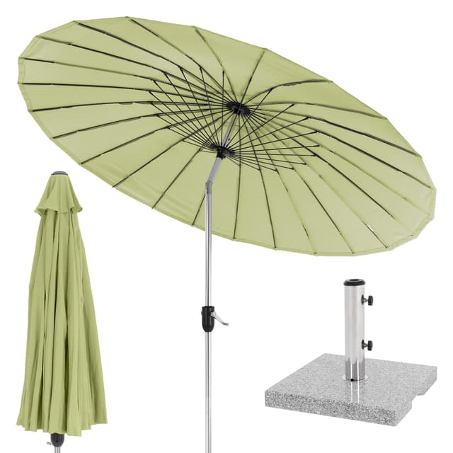 Shanghai parasollen fra ML-Design er en moderne parasol med en generøs diameter på Ø 270 cm. Takket være den store diameter giver den plads nok til at sidde i skyggen under parasollen. Parasollen har en aluminiumsramme og et polyesterbetræk. Takket være sammenfoldefunktionen giver parasollen skygge, selv når solen står lavt, og den har en solbeskyttelsesfaktor på UV 30+. Polyesteren har en tykkelse på 180 g/m². Parasolens 24 glasfiberstænger sikrer en tæt og sikker overdækning.