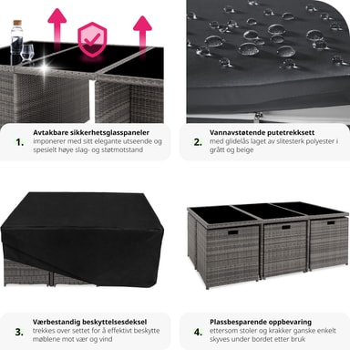 Bygget med holdbare materialer, er dette havemøbelsæt både robust og vejrbestandigt. Polyrattan materialet er kendt for sin holdbarhed og modstandsdygtighed over for vejrets luner, hvilket betyder, at dine møbler forbliver flotte sæson efter sæson. Det medfølgende beskyttelsesovertræk giver ekstra beskyttelse mod regn og UV-stråler, hvilket sikrer, at dit sæt altid ser nyt ud.