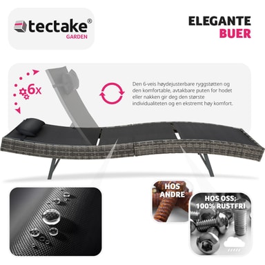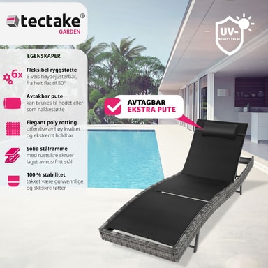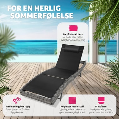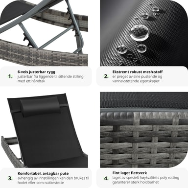 Denne smukke og komfortable liggestol i polyrattan er garanti for skønne solskinstimer i haven, på terrassen eller altanen. Solsengen er velegnet til indendørs og udendørs brug. Ryglænet kan justeres i 5 indstillinger og har en blød nakkepude. Det flettede polyrattan er specielt velegnet til udendørs brug, er modstandsdygtigt overfor snavs og nemt at rengøre. Få mest muligt ud af sommertiden med vores liggestol Delphine.