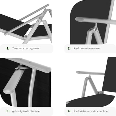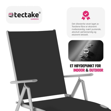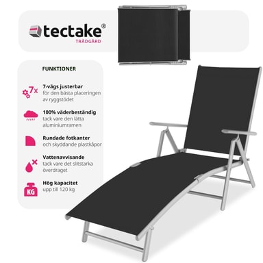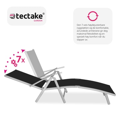 Med den moderne og funktionelle solseng fra tectake ligger du altid godt. Ryglænet kan justeres i syv trin, og det luftgennemtrængelige stof, der former sig efter kroppen, gør det nemt at slappe af. Det fine flet af brudsikre tekstilfibre er ligesom aluminiumsstellet vejrbestandigt og velegnet til udendørs brug. I sammenklappet tilstand kan den lette solseng fra tectake nemt stilles væk.