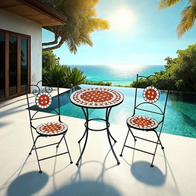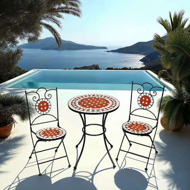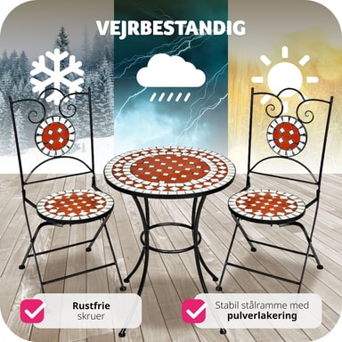 Mosaik havemøbler har altid været populære. Samspillet mellem nostalgi og antik versus moderniteten skaber en behagelig harmoni, der øger værdien af din have og inviterer dig til at blive hængende. Vores mosaik cafésæt består af en stenplade med keramisk mosaik med et stel i stål, samt to klapstole, som også leveres med mosaikker. Denne type møbler er meget robuste og derfor velegnet til terrasse, balkon og have. Pryd haven, terrassen eller altanen med dette romantiske cafésæt.