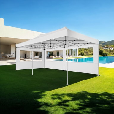 Denne Easy up pavillon med 2 sidestykker er kendetegnet ved at være hurtig og enkel at sætte op. Pavillonen har et saksestel, som bare skal trækkes ud for at teltet bliver klar til brug. Højden på det rustfri stel og den vandtætte pavillon kan justeres efter behov. Da den er lige så nem at slå ned igen, som den er at sætte op, undgår du skader på pavillonen, når den pakkes sammen. Når pavillonen skal transporteres eller opbevares, kan den pakkes ned i den tilhørende taske. En smart løsning til udendørs sammenkomster: Den alsidige Easy up pavillon fra tectake.