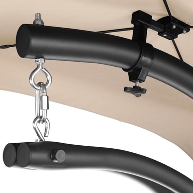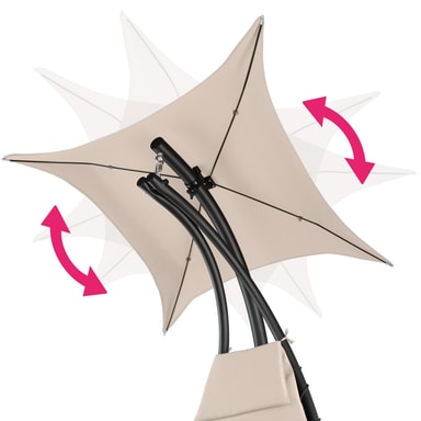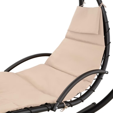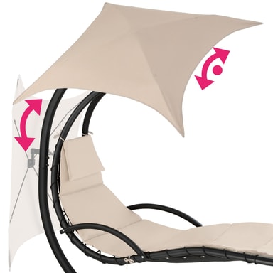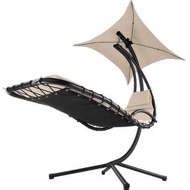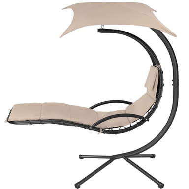 Nyd den afslappende følelse af vægtløshed i en hængeliggestol fra tectake. Den bløde polstrede hynde og den ergonomisk formede liggeflade sørger for en følelse af vægtløshed. Hængestolens solskærm kan drejes og vippes og kan efter behov også fjernes helt. Benene, af pulverlakeret stål, er skrid- og væltesikkert. Det stabile ophæng garanterer en blid gyngen. Oplev selv den attraktive kombination af hængekøje og liggestol i den frit svævende hængeliggestol fra tectake.