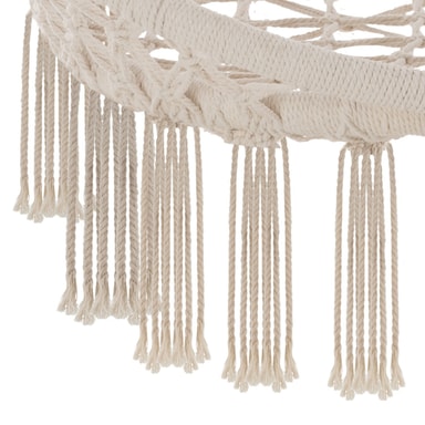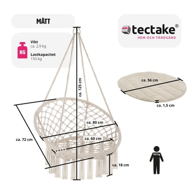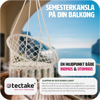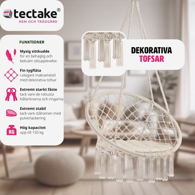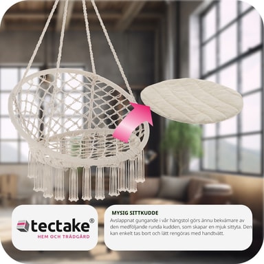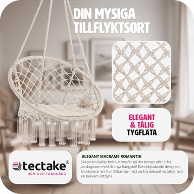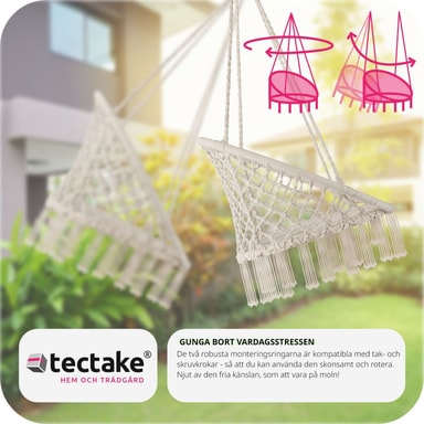 Svæv afslappet i hængestolen Jane fra tectake. Det lette bomuldsflet og den bløde hynde tilpasser sig kroppen. Ud over komfort har hængkøjestolen pyntekvaster på undersiden, der giver stolen den helt rigtige bohemestil. Hængestolen egner sig både til indendørs og udendørs brug, og på grund af den lave vægt kan den tages med overalt. Nyd en spændende bog eller et godt glas rødvin, mens du svinger roligt i den komfortable hængestol fra tectake.