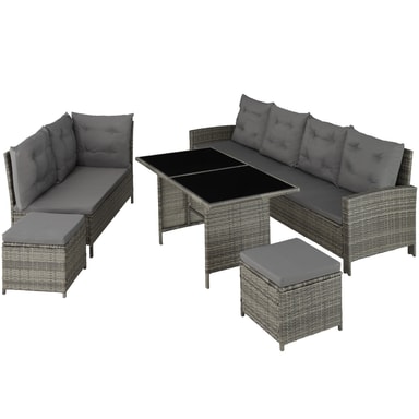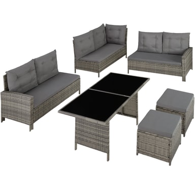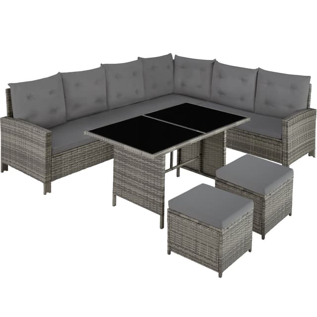 Nyd hyggelige og festlige stunder med familie eller venner i dette skønne havemøbelsæt fra tectake. De bløde hynder og taburetten som ekstra siddemulighed eller til bekvemt at lægge fødderne op på sørger for afslappede stunder som i stuen under åben himmel. Havesofaens enkelte elementer kan justeres variabelt og kan igen og igen arrangeres elegant og raffineret på nye måder. Det stærke understel af stål og det robuste flet af polyrattan garanterer den høje slidstyrke i disse havemøbler fra tectake.