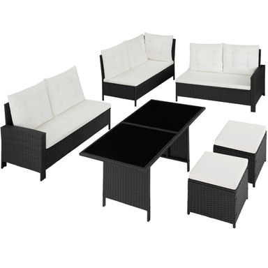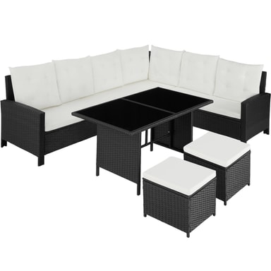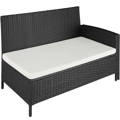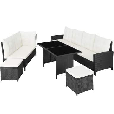 Nyd hyggelige og festlige stunder med familie eller venner i dette skønne havemøbelsæt fra tectake. De bløde hynder og taburetten som ekstra siddemulighed eller til bekvemt at lægge fødderne op på sørger for afslappede stunder som i stuen under åben himmel. Havesofaens enkelte elementer kan justeres variabelt og kan igen og igen arrangeres elegant og raffineret på nye måder. Det stærke understel af stål og det robuste flet af polyrattan garanterer den høje slidstyrke i disse havemøbler fra tectake.