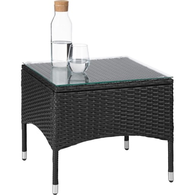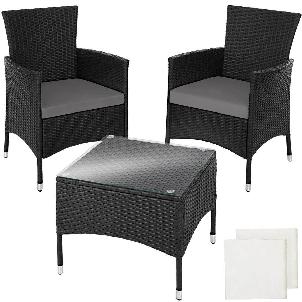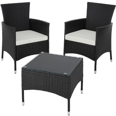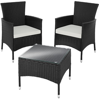 Om det er på altanen, terrassen eller i haven: Med et polyrattan havemøbelsæt Bern fra tectake kan man nyde sommeren på bedste vis derhjemme. Havemøbelsættet med to stole og et lille bord med glasplade behøver på grund af sin kompakte udformning ikke megen plads og den kan nærmest stilles op overalt. Hynderne af polyester er afstemt fint med polyrattansættets farver. Det smarte sæt forener en behagelig siddekomfort med minimal vedligeholdelse. Desuden medfølger der også et ekstra sæt hyndebetræk til havemøbelsættet. Overfladen er imprægneret for at beskytte hynden mod fugt - snavs og vanddråber preller simpelthen af. Slap af uden bekymringer i dit polyrattan havemøbelsæt fra tectake.