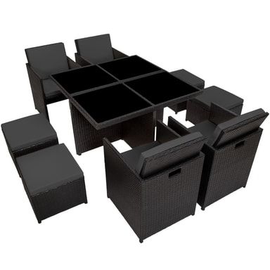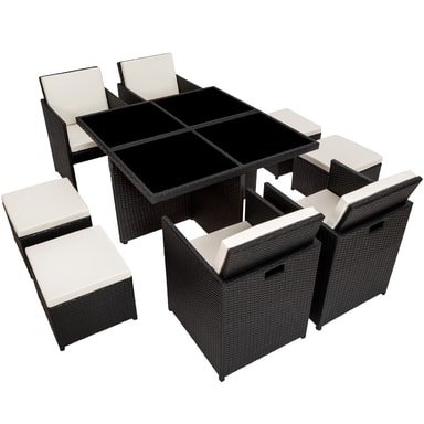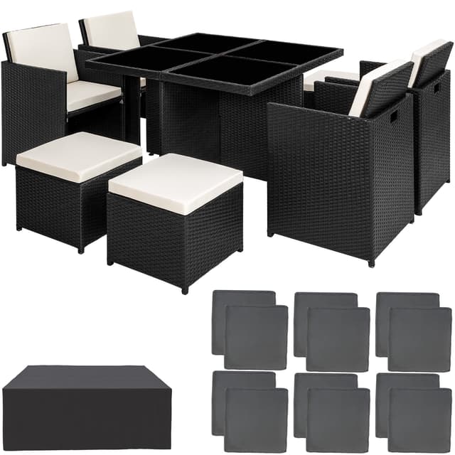 Med et havemøbelsæt i polyrattan får du 4 havestole, 4 skamler og et rummeligt kvadratisk bord, der giver god plads til gæster i sommerperioden. Havemøblerne kan både bruges på terrassen eller direkte på græsplænen. Havsættet er udarbejdet i vejrbestandigt polyrattan, der giver det en ekstra lang holdbarhed. Der medfølger også et beskyttelsesovertræk, der gør det endnu nemmere at beskytte møblerne mod vejret. Sættet kan opbevares kompakt, da alle stolene kan skubbes helt ind under bordet. Gør denne sommer ekstra komfortabel med et polyrattan havemøbelsæt fra tectake.