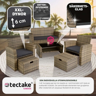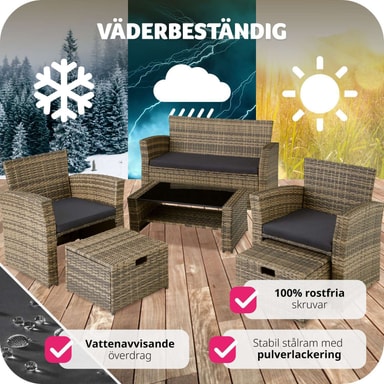 Modena er skabt af høj kvalitet, UV-bestandigt rattan, der giver både langvarig holdbarhed og et luksuriøst udseende. Det stabile stel af stål sikrer robusthed, mens de bløde, vandafvisende hynder tilføjer et ekstra lag af komfort. Hyndernes aftagelige og vaskbare betræk gør det nemt at holde dem friske og indbydende.