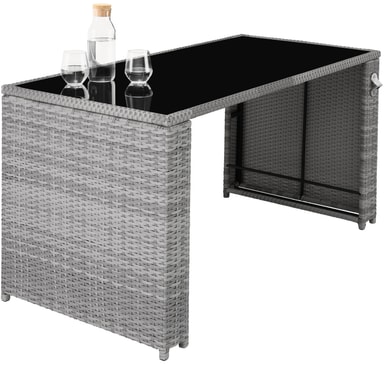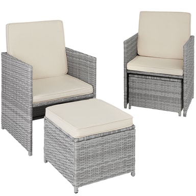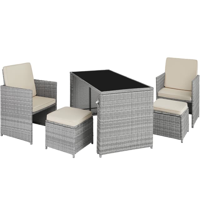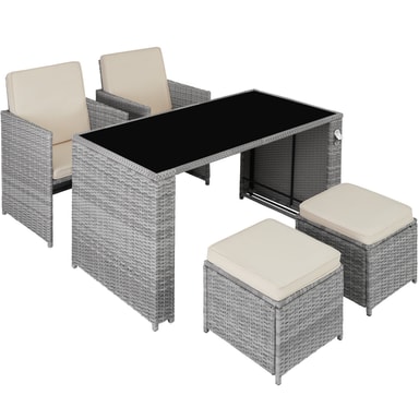 Tectakes praktiske havemøbelsæt i polyrattan, Palermo, sætter et smukt præg på dit udendørsområde. Det indbydende havemøbelsæt imponerer visuelt med det fine flet af slidstærk polyrattan og struktur med det solide stel af pulverlakeret stål. Havemøbelsættets polyrattan er også UV-bestandigt, så falmer langt mindre i farven henover tid end andre produkter. Den komfortable skammel giver en ekstra siddeplads, og ellers kan man bare kan lægge fødderne op. Centrum for loungesættet finder du det stilrene havebord med aftagelig sikkerhedsglasplade. Desuden har havebordet også aftagelig flaskåbner, så du ikke skal bekymre dig om at skulle finde en oplukker mens du slapper af. De bløde hynder sørger for afslappede stunder i stuen eller under åben himmel. Takket være de vand- og smudsafvisende egenskaber, kræver de pladsbesparende havemøbler kun lidt rengøring og kan hurtigt og nemt skubbes sammen efter brug.