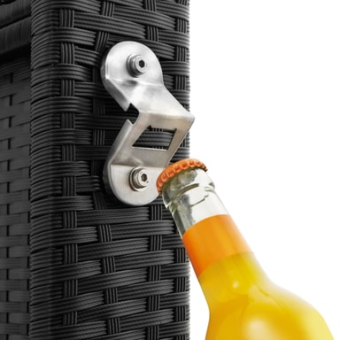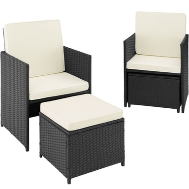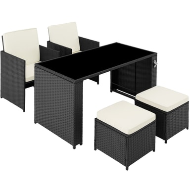 Tectakes praktiske havemøbelsæt i polyrattan, Palermo, sætter et smukt præg på dit udendørsområde. Det indbydende havemøbelsæt imponerer visuelt med det fine flet af slidstærk polyrattan og struktur med det solide stel af pulverlakeret stål. Havemøbelsættets polyrattan er også UV-bestandigt, så falmer langt mindre i farven henover tid end andre produkter. Den komfortable skammel giver en ekstra siddeplads, og ellers kan man bare kan lægge fødderne op. Centrum for loungesættet finder du det stilrene havebord med aftagelig sikkerhedsglasplade. Desuden har havebordet også aftagelig flaskåbner, så du ikke skal bekymre dig om at skulle finde en oplukker mens du slapper af. De bløde hynder sørger for afslappede stunder i stuen eller under åben himmel. Takket være de vand- og smudsafvisende egenskaber, kræver de pladsbesparende havemøbler kun lidt rengøring og kan hurtigt og nemt skubbes sammen efter brug.