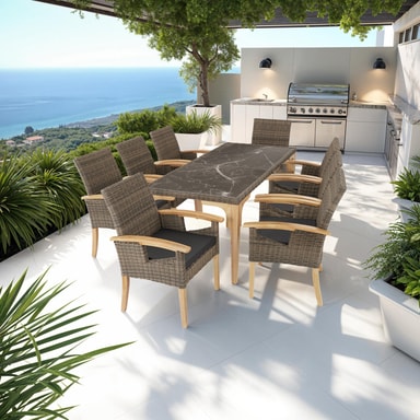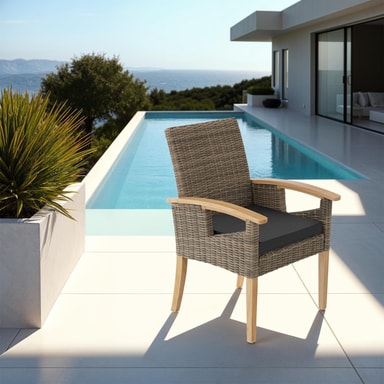 Skab en atmosfære i dit udendørsområde til afslapning og hygge med den komfortable polyrattan havestol Rosarno fra tectake. Den store polstring, det høje ryglæn og de buede armlæn på denne havestol sørger for en behagelig siddeplads. Udover træelementerne er det meget naturligt udseende fletværk, der bestemmer udseendet af den plejevenlige lænestol, der ligesom de øvrige materialer er absolut vejrbestandig. Den ekstremt gode stabilitet og høje spændstighed skyldes de fire solide ben - behageligt, smart og robust: den alsidige Rosarno polyrattan havestol fra tectake.