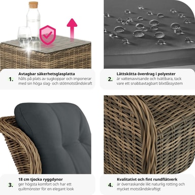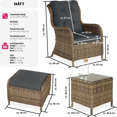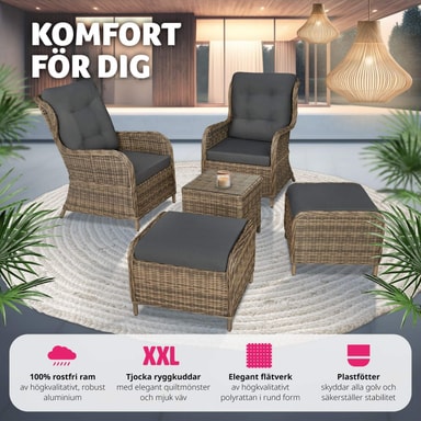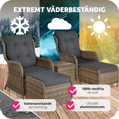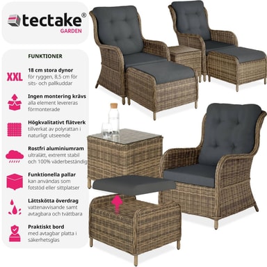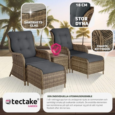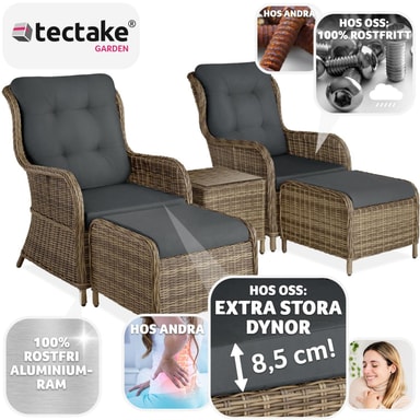 Dette færdigt monterede havemøbelsæt med både havestole og havebord fra tectake sætter kun udseende og komfort i højsædet med sit svungne design. Det fint forarbejdede, runde fletværk kan i sin struktur og sit mønster næsten ikke skelnes fra ægte rattan. De tykke, vandafvisende hynder og taburetten som fodstøtte giver afslapning i havemøblerne helt nye dimensioner. Desuden har havebordet aftageligt sikkerhedsglasplade som bidrager til eksklusivitet. Til brug i det fri er disse rustfrit havemøbler med den meget robuste overflade af polyrattan og det stabile understel af aluminium perfekt egnet. havestolene indbyder til masser af afslapning i haven. Smid benene op og nyd sommervarmen med disse havestole fra tectake.