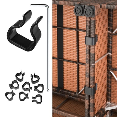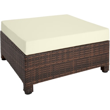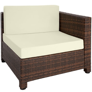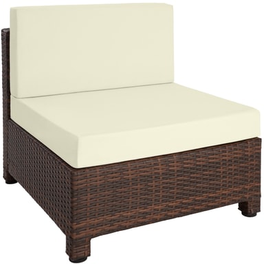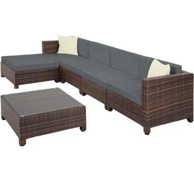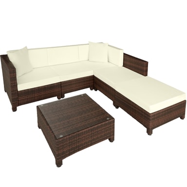 Indbyd til mange hyggelige stunder i haven med et lækkert og stilfuldt loungesæt i det vejrbestandige polyrattan. Sidde-, hjørneelementer samt skammel er lavet af aluminium og betrukket med polyrattan. Herved opnås den lave vægt, uden at det går ud over stabiliteten. Bordpladen af glas giver siddegruppen et eksklusivt look, og er fantastisk let at rengøre. De creme-farvede siddepuder af polyester matcher møblernes farve, og leveres med en lynlås på agsiden, så puderne nemt kan rengøres. For at beskytte fyldet mod fugt er overfladen imprægneret. Snavs og vanddråber løber simpelthen bare af. Sættets forskellige elementer kan arrangeres, som man har lyst til, så man kan tilpasse dette loungesæt til begivenheden og selskabet.