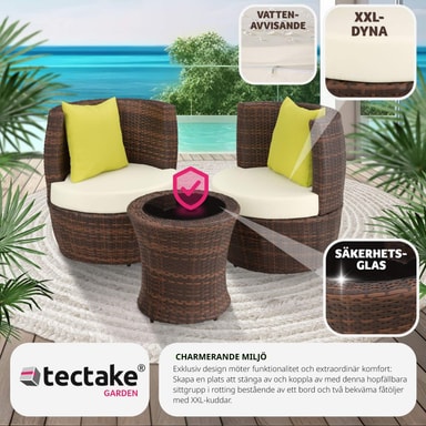 Lille sæt med stor virkning: Det elegante og moderne polyrattan loungesæt fra tectake er den ultimative løsning for dig, der ønsker smukke, holdbare og pladsbesparende havemøbler til dit udendørsområde.