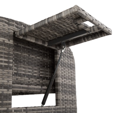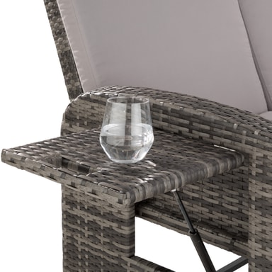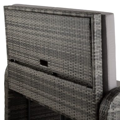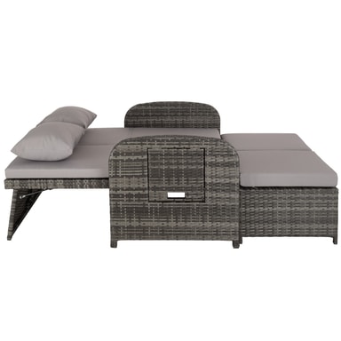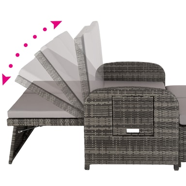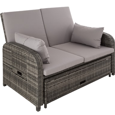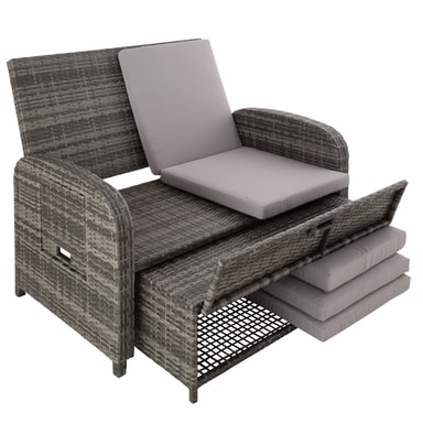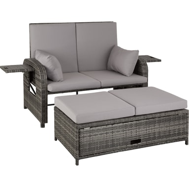 Den multifunktionelle rattan havesofa fra tectake med sine bløde hynder og det højdejusterbar ryglæn giver fremragende sidde- og liggekomfort. Med et par få greb bliver den elegante sofa til en indbydende liggestol. Begge borde på siden kan klappes ud. Den kompakte sofa og den praktiske taburet med opbevaringsplads til de bekvemme og vandafvisende hynder leveres færdigmonteret. Flettet af slidstærk polyrattan og stabilt understel af aluminium, der gør denne rustfri rattan havesofa fra tectake til det perfekte udendørsmøbel.