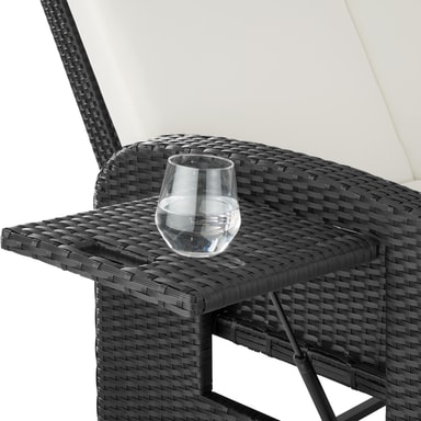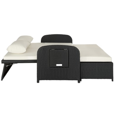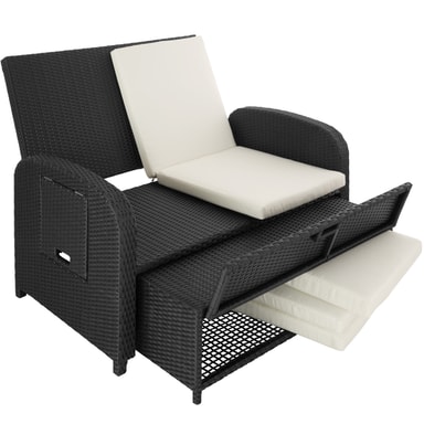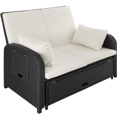 Den multifunktionelle rattan havesofa fra tectake med sine bløde hynder og det højdejusterbar ryglæn giver fremragende sidde- og liggekomfort. Med et par få greb bliver den elegante sofa til en indbydende liggestol. Begge borde på siden kan klappes ud. Den kompakte sofa og den praktiske taburet med opbevaringsplads til de bekvemme og vandafvisende hynder leveres færdigmonteret. Flettet af slidstærk polyrattan og stabilt understel af aluminium, der gør denne rustfri rattan havesofa fra tectake til det perfekte udendørsmøbel.