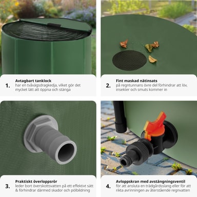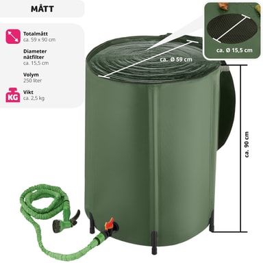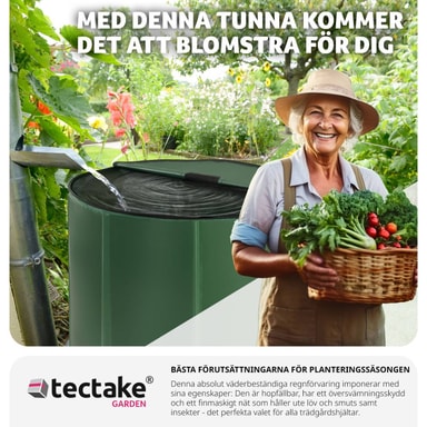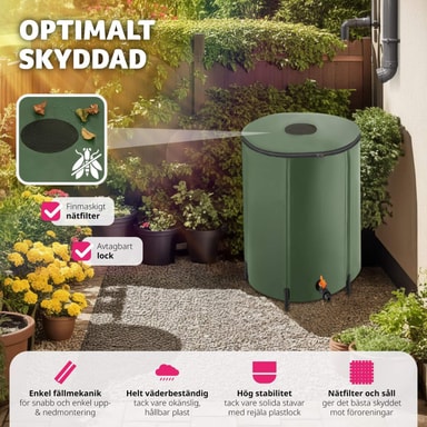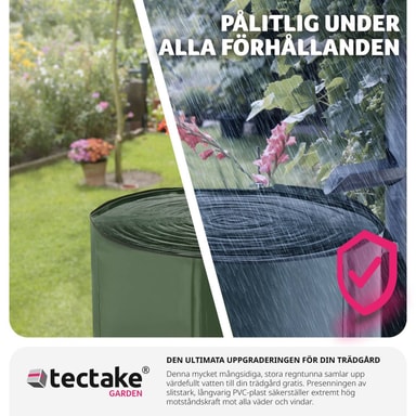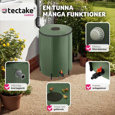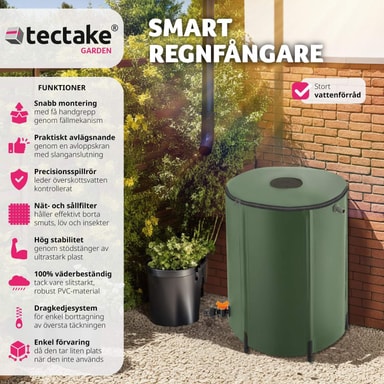 Den alsidigt anvendelige regnvandsbeholder fra tectake opsamler gratis værdifuldt vand til din have. Takket være den nemme foldemekanisme kan den lette regnvandsbeholder hurtigt sættes op og tages ned og opbevares uden stort pladsbehov. Indtagningsgitteret på oversiden af regnvandstønden beskytter indholdet mod blade, skidt og insekter. Stængerne og presenningen af robust polychlorid sikrer regnvandstankens nødvendige stabilitet og den store modstandskraft over for påvirkninger udefra.