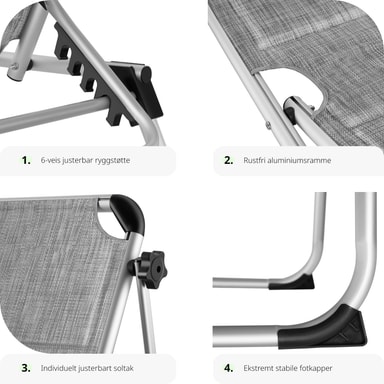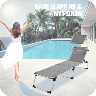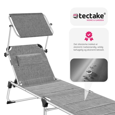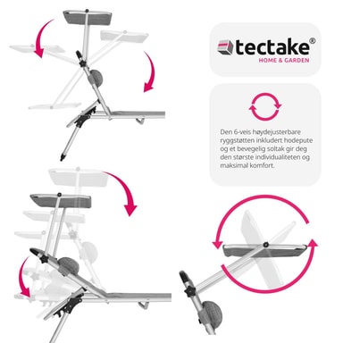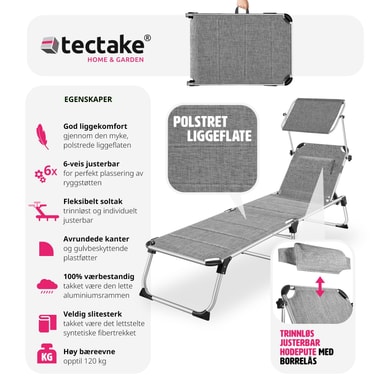 Sikr dig den bedste plads i solen, med den funktionelle liggestol Lorella fra tectake. Den stabile aluminiumsramme og det slidstærke betræk garanterer maksimal stabilitet og stor holdbarhed. Takket være den gennemtænkte foldemekanisme og den lave vægt, kan foldesengen let transporteres med dens praktiske bærehåndtag og er let at opbevare. Ryglænet, som kan justeres i seks trin, den behagelige hovedpude og det justerbare solsejl gør, at feriefølelsen er i top på liggestolen.