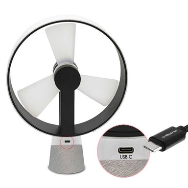 Stor fan med fransk design. Strømforsyning via USB-C. Adapter og ledning inkluderet. Bruger så lidt strøm, at du kan drive det fra en powerbank eller fra et USB-stik på din PC/Mac. 21 cm i diameter, 7 cm tyk.